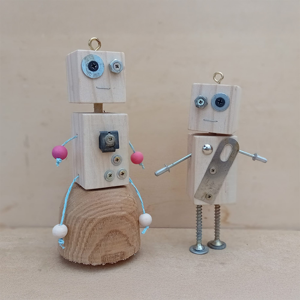 Esta propuesta será una actividad creativa y divertida en la que los participantes podrán construir su propio robot a partir de distintas piezas de madera y pequeños elementos metálicos. A lo largo del taller tendrán un primer contacto con herramientas básicas y descubrirán cómo se pueden ensamblar diferentes elementos para dar forma a una estructura.