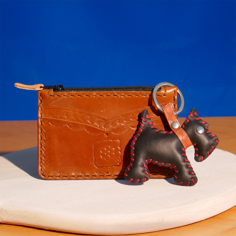 En este taller crearemos dos piezas en cuero: un llavero con forma de corazón o perro y un monedero con cremallera, aplicando técnicas básicas de marroquinería.