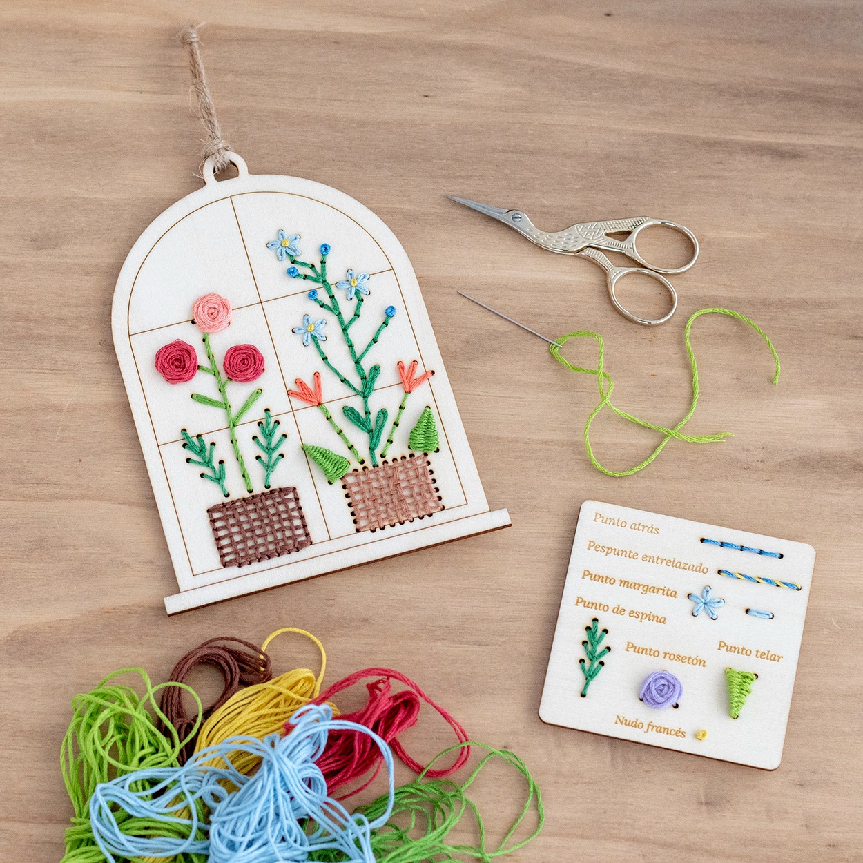 Durante la sesión cada participante trabajará sobre una pieza de madera con un diseño exclusivo: una ventana abierta desde la que brotan formas y motivos botánicos. A lo largo del proceso aprenderemos distintos puntos de bordado que nos permitirán construir contornos, añadir detalles delicados y generar volumen y textura en la composición.