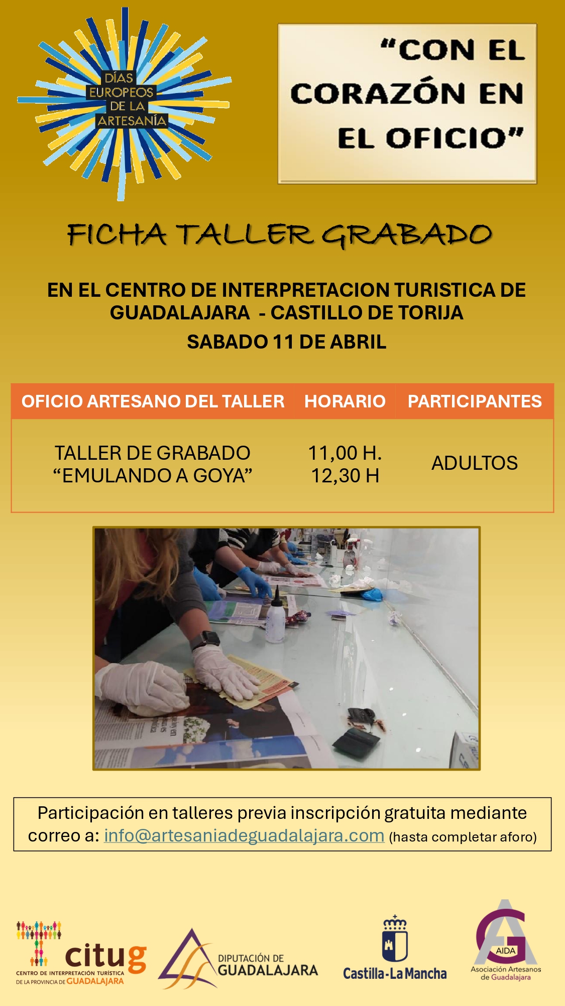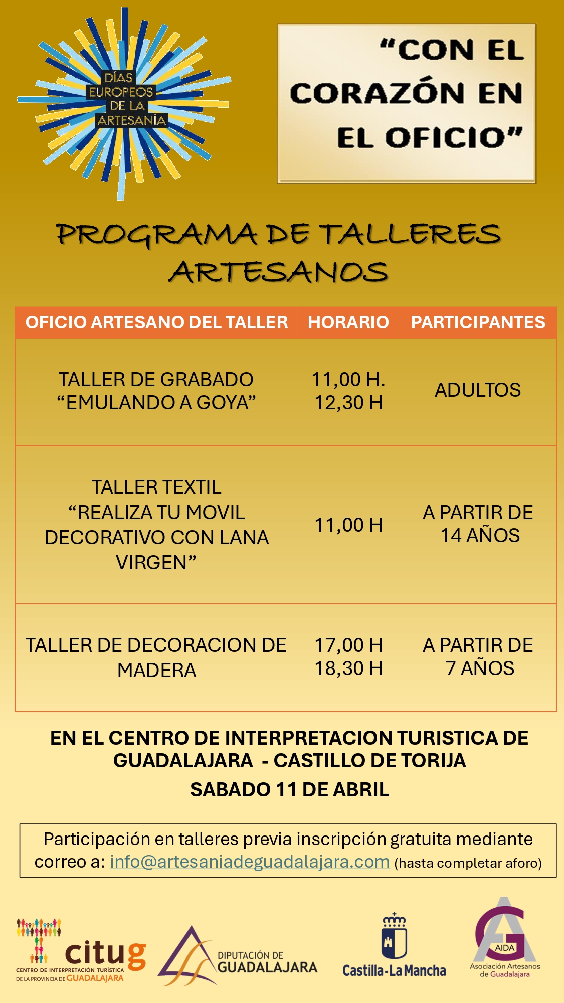 La participación es totalmente gratuita, siendo necesaria la inscripción previa para su participación en el correo: info@artesaniadeguadalajara.com