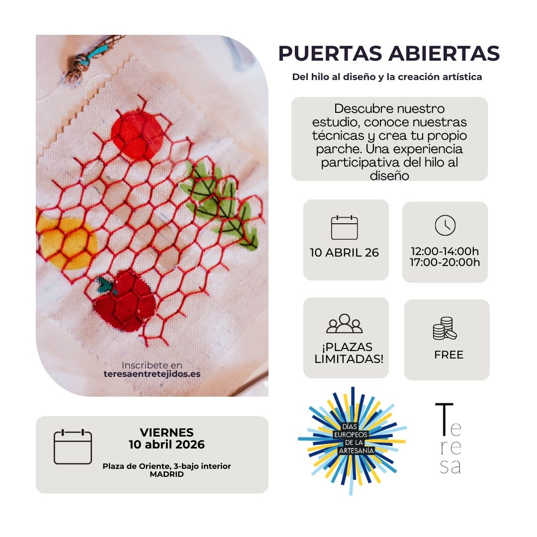 En el marco de los Días Europeos de la Artesanía, abrimos nuestro estudio para compartir nuestro proceso creativo de cerca, el proceso artesanal. Durante la visita, podrás conocer el espacio, descubrir las técnicas con las que trabajamos y participar activamente en la creación de un parche bordado (no es un taller). Una experiencia pensada para acercarse al oficio desde dentro, entendiendo cada paso: del hilo al diseño y a la pieza final.