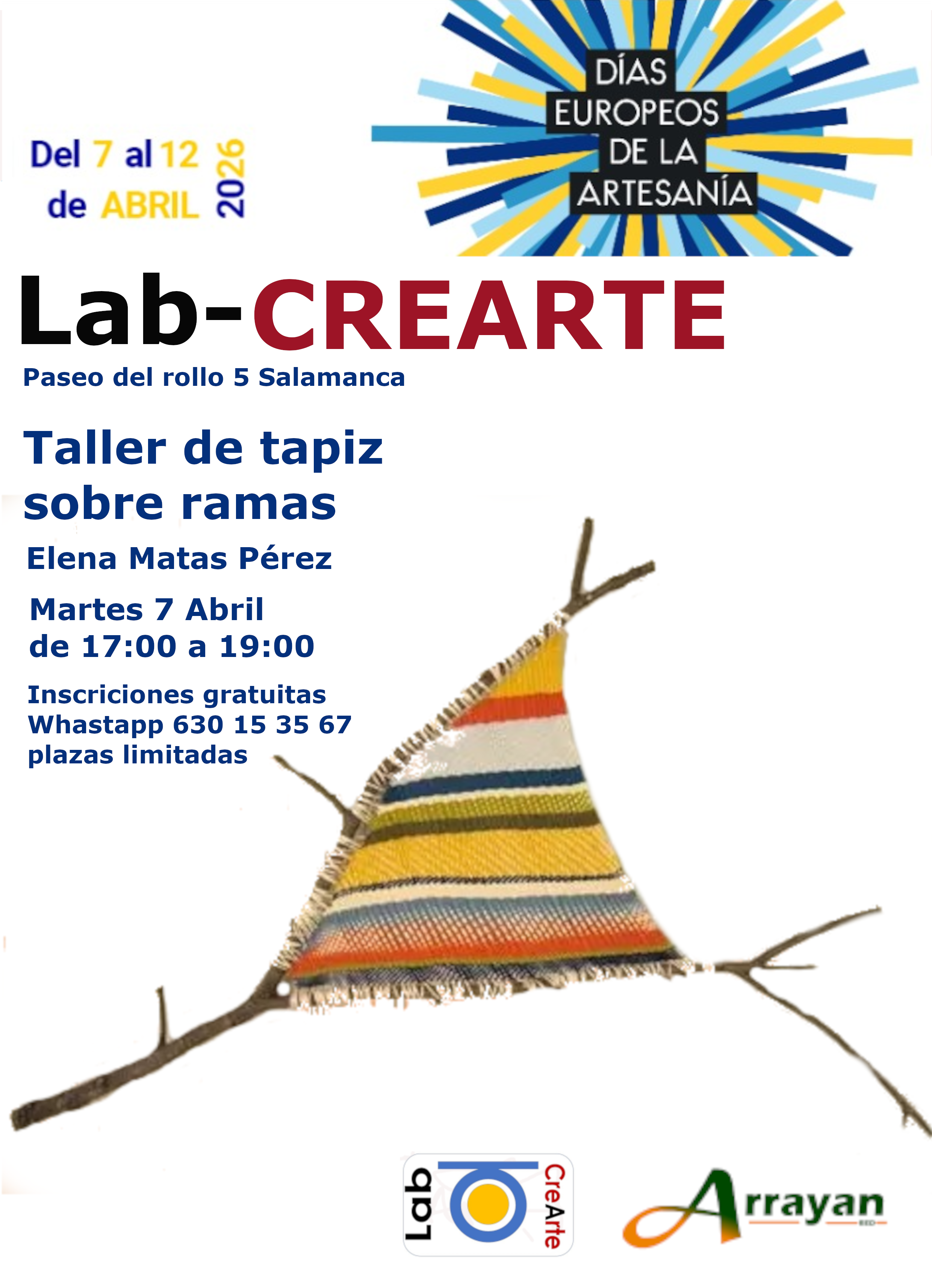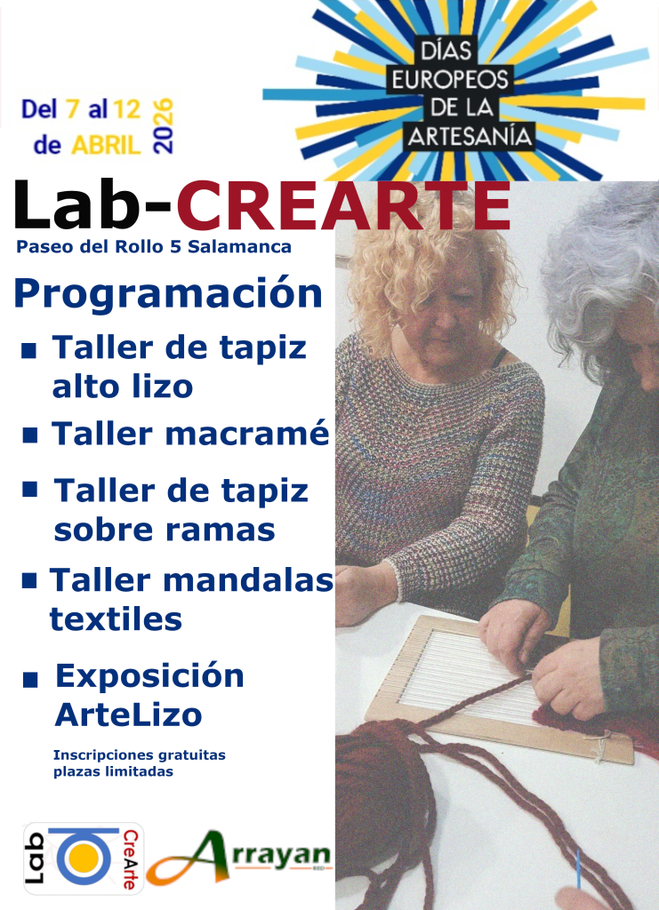 Durante toda la "Semana Europea para la Artesanía", el Lab-CREARTE de Red Arrayán ofrece una "Exposición de Tapices de Alto Lizo" y diferentes talleres vinculados a la Artesanía Textil en el nuevo espacio del Paseo del Rollo, 5 de la ciudad de Salamanca