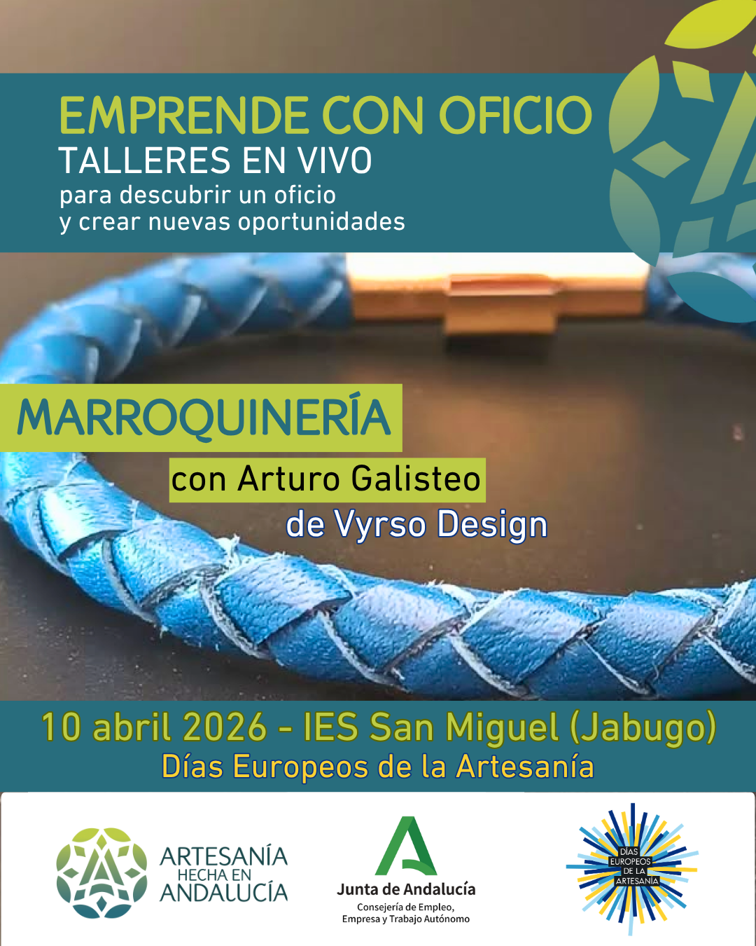 La Delegación Territorial de Empleo, Empresa y Trabajo Autónomo en Huelva organiza un Taller en Vivo de marroquinería en el IES San Miguel de Jabugo, que será impartido por el artesano Arturo Galisteo Mendoza, creador de la marca Vyrso Design.