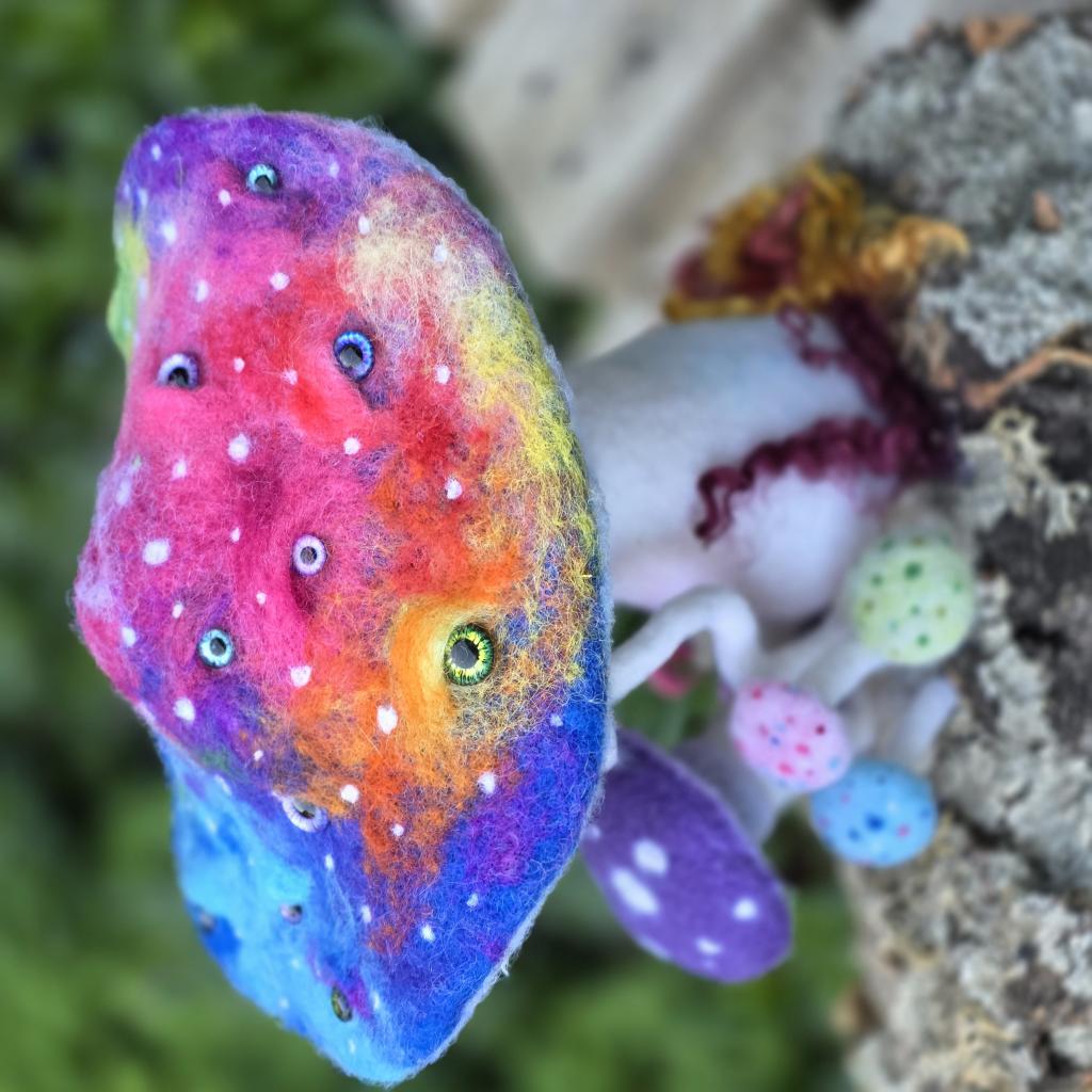 Demostraciones de esculturas de lana realizadas con fieltro de aguja y de la realización de flores de tela.