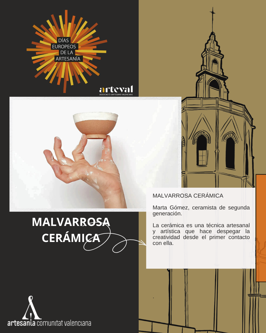 Del 27 de marzo al 12 de abril, ARTEVAL celebra una nueva edición de la Feria de Artesanía de Primavera de València en la emblemática Plaza de La Reina, uno de los espacios más representativos y visitados de la ciudad, un entorno histórico de reconocido valor cultural y patrimonial, en este contexto del 6 al 12 de abril se desarrollará la programación especial de los Días Europeos de la Artesanía.
