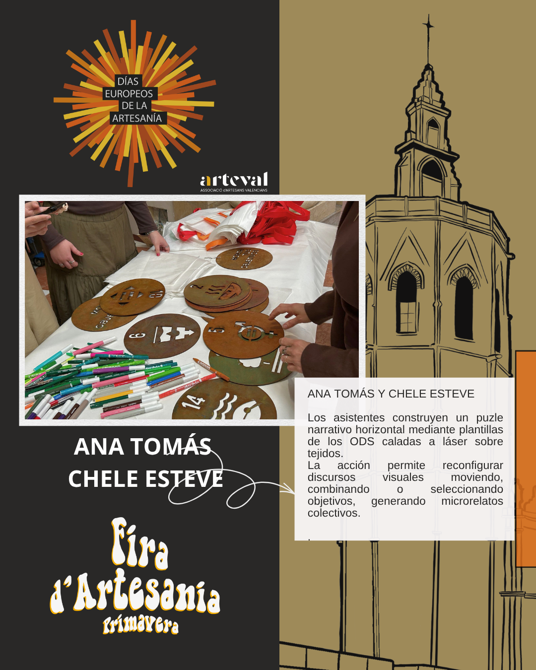 Del 27 de marzo al 12 de abril, ARTEVAL celebra una nueva edición de la Feria de Artesanía de Primavera de Valéncia en la emblemática Plaza de La Reina, uno de los espacios más representativos y visitados de la ciudad, un entorno histórico de reconocido valor cultural y patrimonial, en este contexto del 6 al 12 de abril se desarrollará la programación especial de los Días Europeos de la Artesanía.
