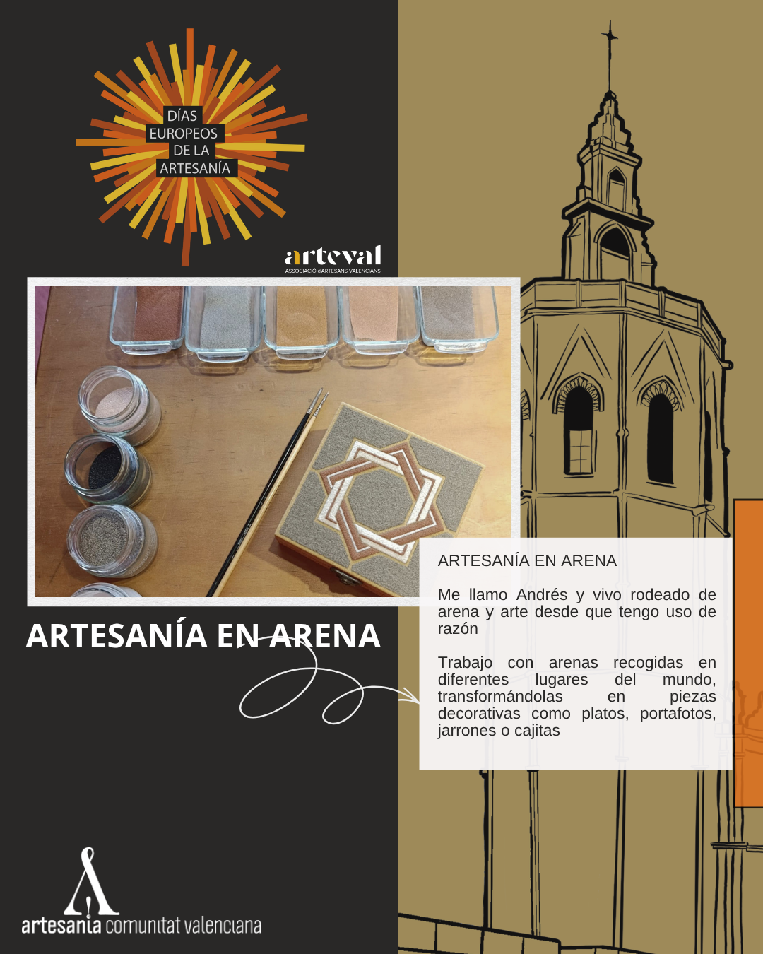Del 27 de marzo al 12 de abril, ARTEVAL celebra una nueva edición de la Feria de Artesanía de Primavera de València en la emblemática Plaza de La Reina, uno de los espacios más representativos y visitados de la ciudad, un entorno histórico de reconocido valor cultural y patrimonial, en este contexto del 6 al 12 de abril se desarrollará la programación especial de los Días Europeos de la Artesanía.