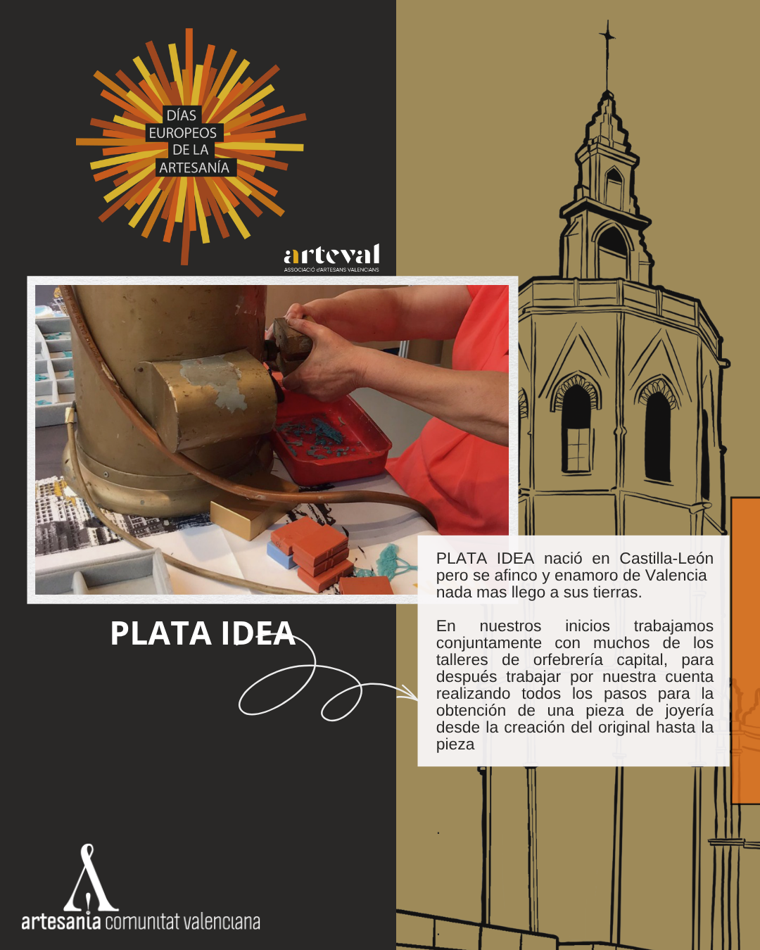Plata-Idea nació en Castilla-León pero definitivamente se afinco y enamoro de Valencia nada mas llego a sus tierras. En nuestros inicios trabajamos en conjunto con prácticamente todos los talleres de orfebrería de la capital, para posteriormente trabajar por nuestra cuenta realizando todos los pasos para la obtención de una pieza de joyería desde la creación del original hasta la pieza acabada.