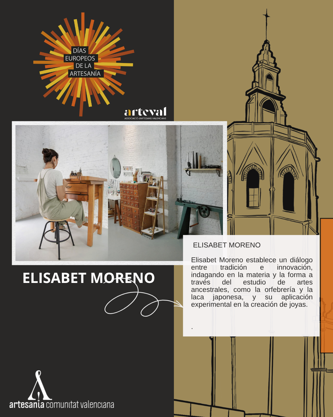 Elisabet Moreno establece un diálogo entre tradición e innovación, indagando en la materia y la forma a través del estudio de artes ancestrales, como la orfebrería y la laca japonesa, y su aplicación experimental en la creación de joyas.