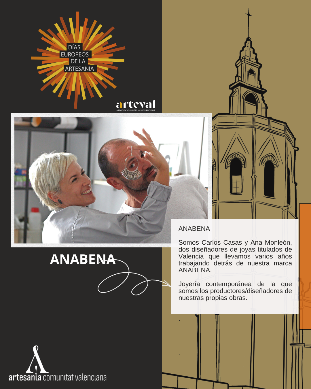 Somos Carlos Casas y Ana Monleón, dos diseñadores de joyas titulados de Valencia que llevamos varios años trabajando detrás de nuestra marca ANABENA,  joyería contemporánea de la que somos los productores/diseñadores de nuestras propias obras.
