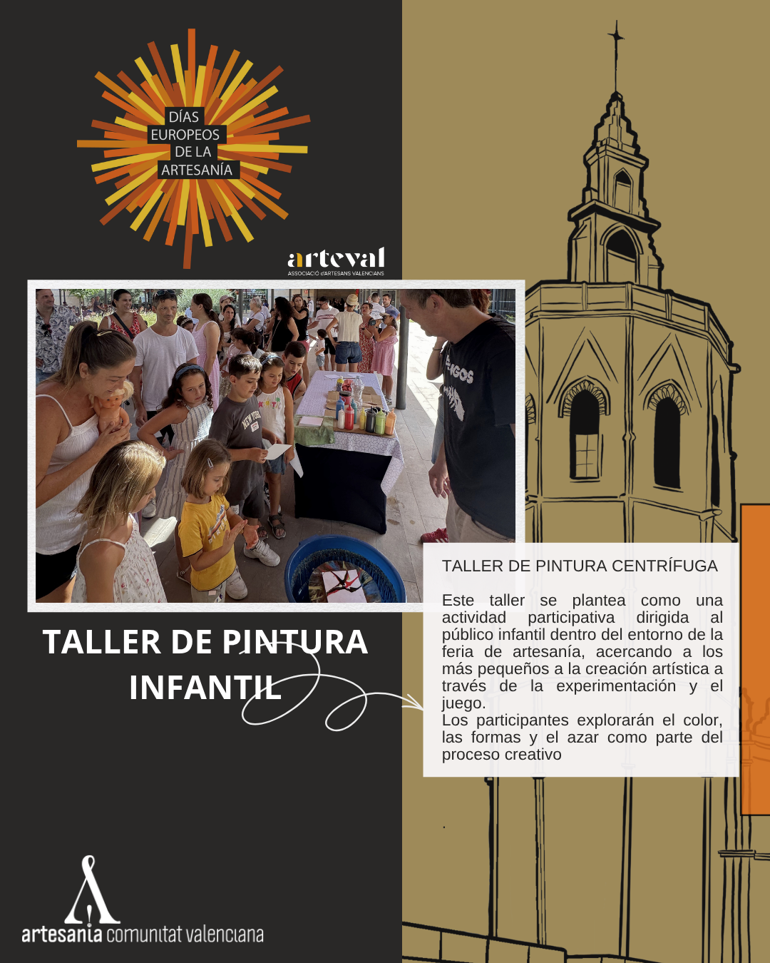 Este taller de pintura centrífuga se plantea como una actividad participativa dirigida al público infantil dentro del entorno de la feria de artesanía, acercando a los más pequeños a la creación artística a través de la experimentación y el juego.