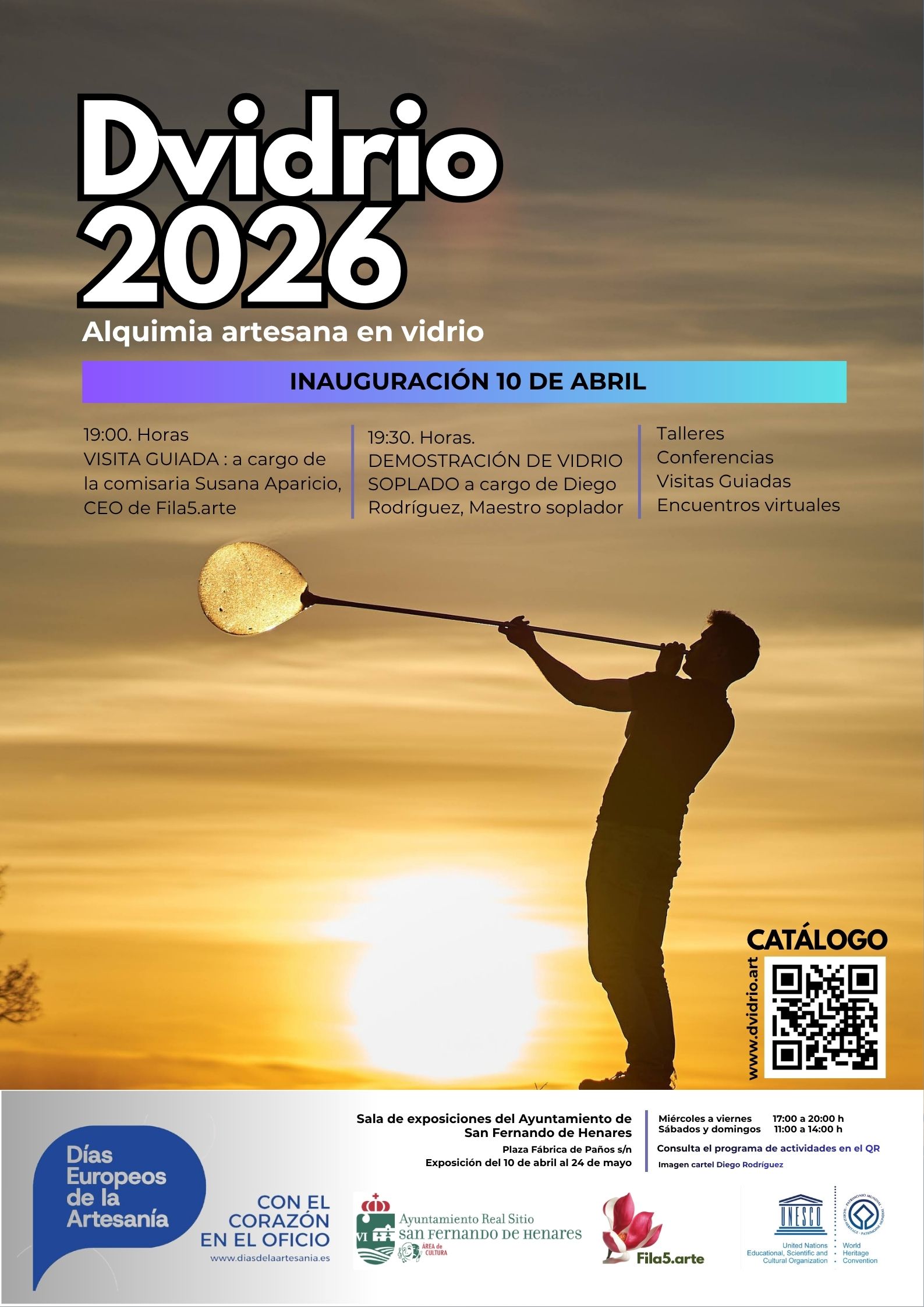 Desde el Ayuntamiento de San Fernando de Henares en Madrid, en 2026 se pone el foco en las artes del vidrio, reivindicando junto a Fila5.arte la vuelta de los oficios al panorama artístico, con una cuidada selección de obras y autores de seis Comunidades Autónomas en las que los oficios del vidrio tienen representación.
