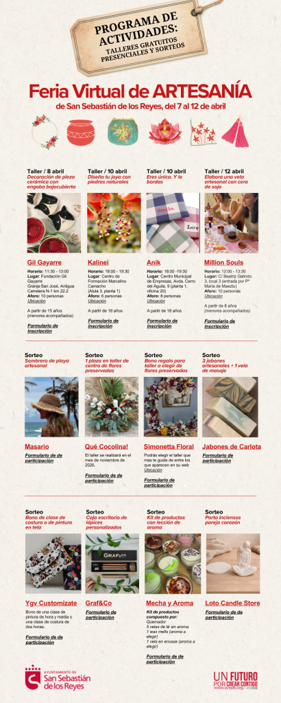 La Feria Virtual de Artesanía de San Sebastián de los Reyes, que se celebrará del 7 al 12 de abril en el marco de los Días Europeos de la Artesanía, es una iniciativa que pone en valor el talento artesanal del municipio y acerca a la ciudadanía a los oficios creativos y tradicionales.