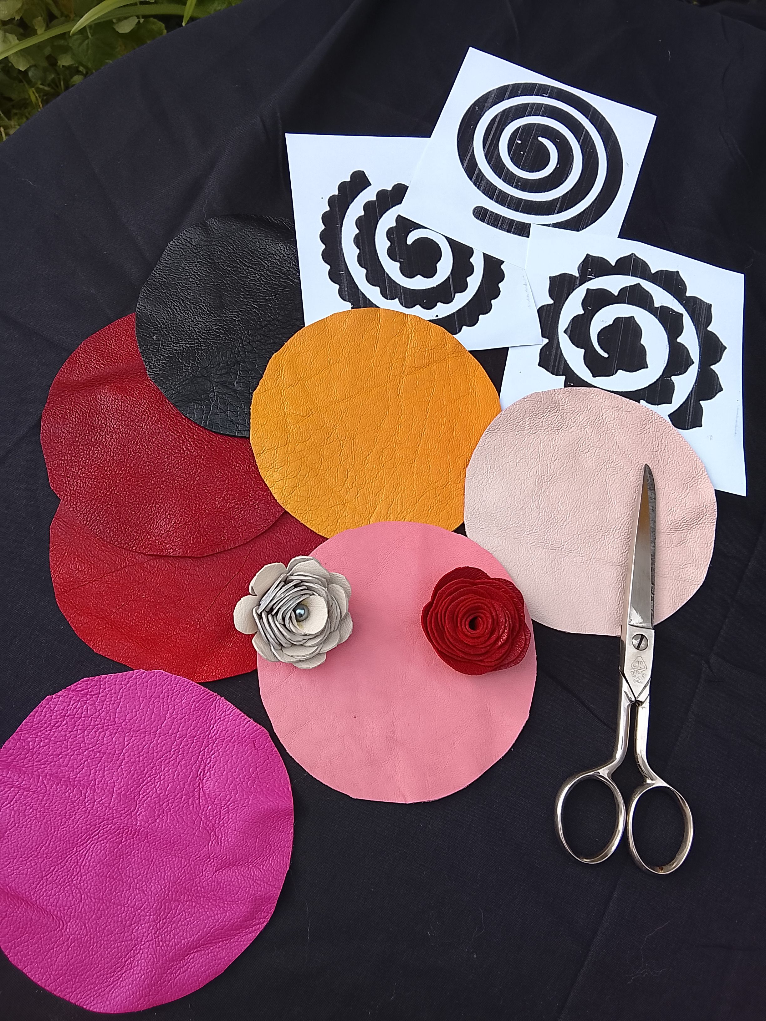 Empezarán con el patrón en papel y luego lo pasan a piel, lo recortan y darán la forma de flor final.