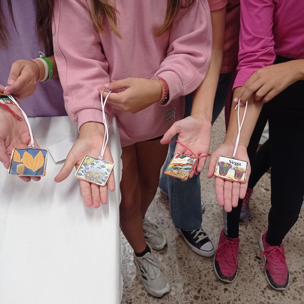 cada participante hará un colgante con dos vidrios y ccinta de cobre con un collage hecho por ellos entre medias, se soldará una anilla y se pondrá un cordón.