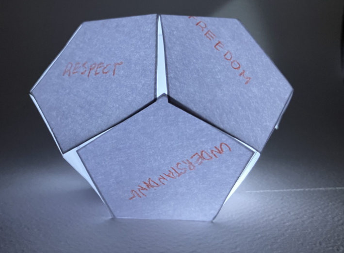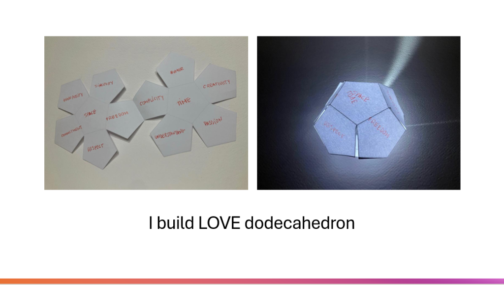 Los participantes se sumergirán en en un entorno en que el amor y la paz toman formas geométricas siguiendo los modelos naturales. Se construirán unos dodecaedros que emulan rosas rojas donde 5 de las caras representarán los imprescindibles del amor y las otras 5 los refrescantes del amor. Así construiremos una escultura mundial que registre los ingredientes del amor y lo pongan en primera línea como antesala de al paz.