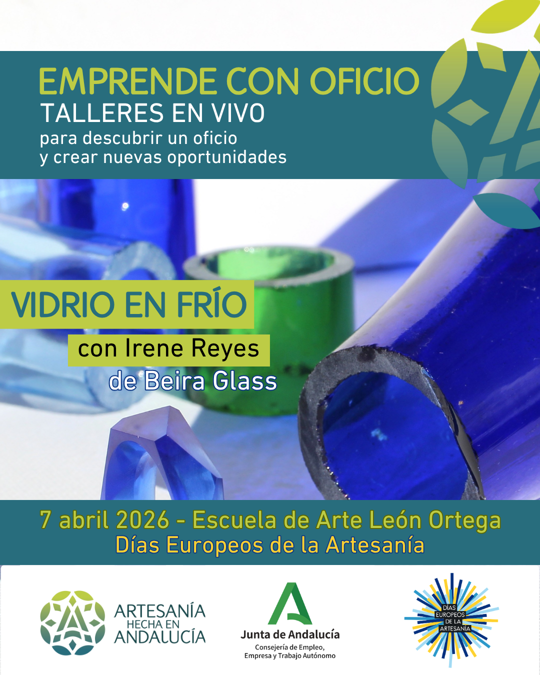 La Delegación Territorial de Empleo, Empresa y Trabajo Autónomo en Huelva organiza un Taller en Vivo de estirado y talla de vidrio en la Escuela de Arte y Superior de Diseño León Ortega, que será impartido por la artesana Irene Reyes Mesa.