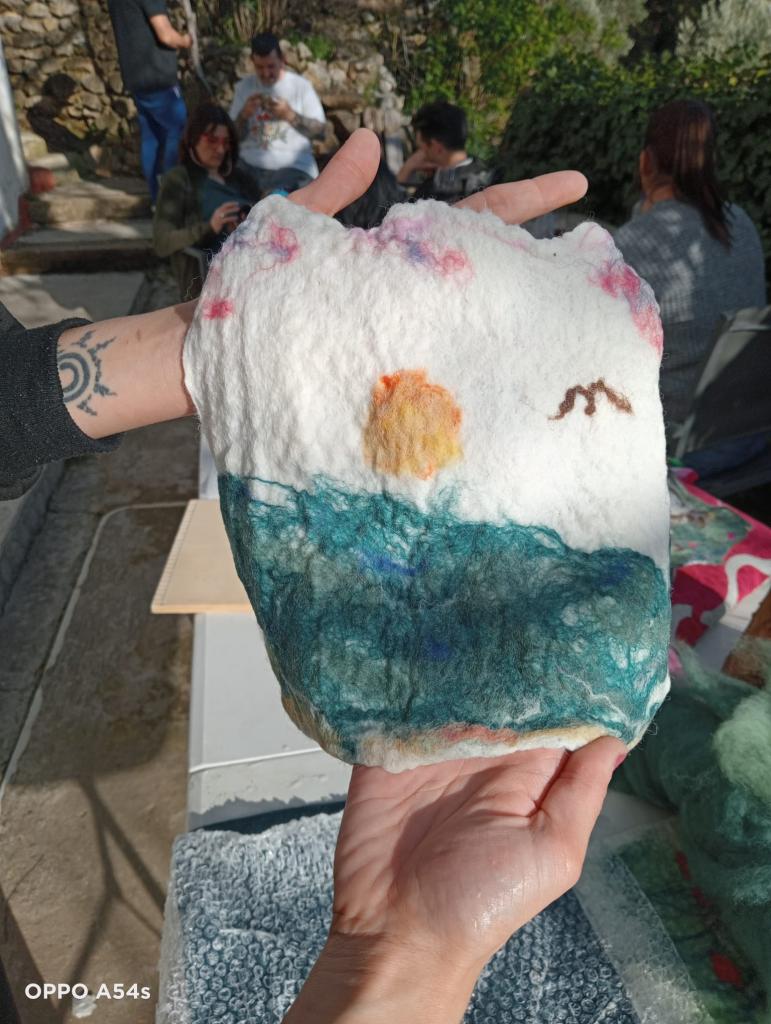 Haremos fieltro, partiendo del vellón de lana en crudo, superponiendo capas de vellón de lana, humedeciendo y amasado hasta conseguir una pieza compacta. Que se podrá usar de diferentes maneras.
